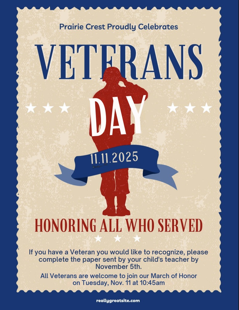 On Tuesday, November 11, we will be honoring US veterans at Prairie Crest by having a Veterans March of Honor. Veterans will be honored as they walk through the hallways and are recognized by all of our Crest students.